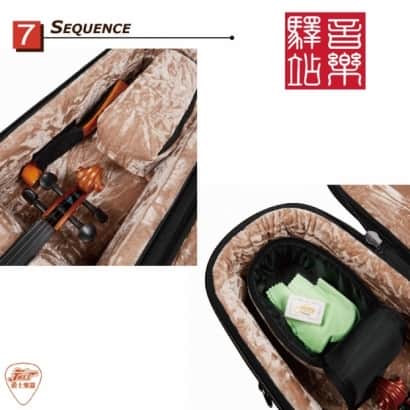 小提琴包內部上方有一個配件口袋,可以放松香和琴布等。