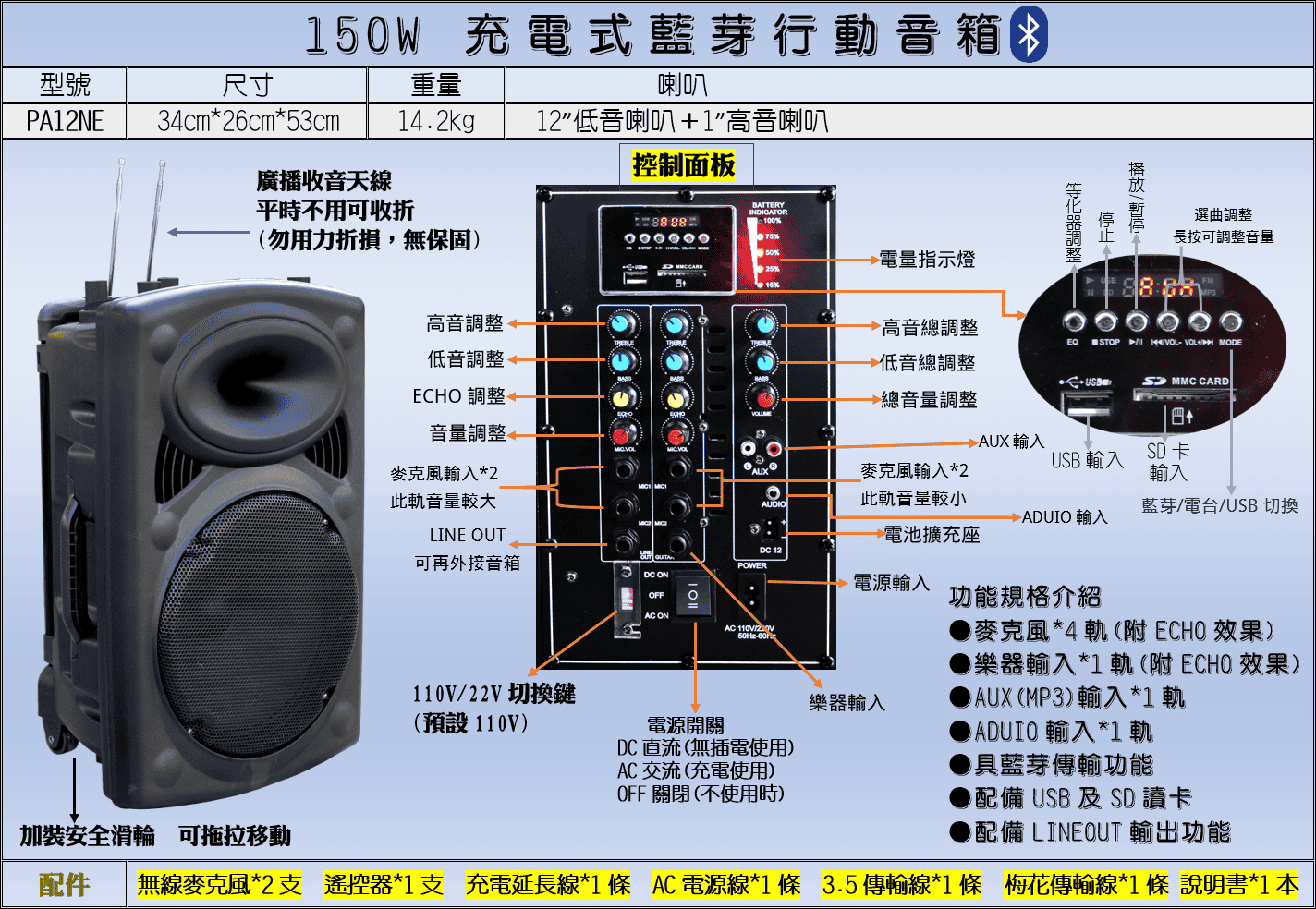 喇叭規格 : 12 "低音喇叭 + 1"高音喇叭
