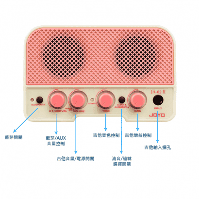 功率 : 5 W 喇叭單體 : 2.5 " 雙喇叭 旋鈕功能 : 音量 x 3、音頻 x 1、破音切換 x 1 藍芽開關 X 1 插孔 : 6.3mm x 1、3.2mm x 2 電源 : 5V DC, 1A 顏色 : 櫻花粉、清新藍 尺寸 : 147 x 75 x 96 mm 重量 : 330 g 配件 : USB Type-C 充電線 x1 條 使用說明書 x 1本